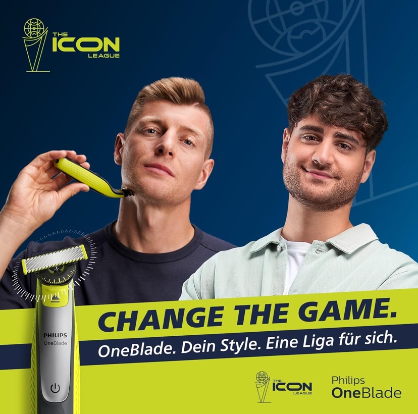 Philips OneBlade Face & Body – Elektrischer Bartschneider, Rasierer und Bodygroomer zum Trimmen, Stylen und Rasieren, 3x Original-Klingen, 1x 5-in-1 Trimmaufsatz, 2x Körperaufsätze, QP2824/30