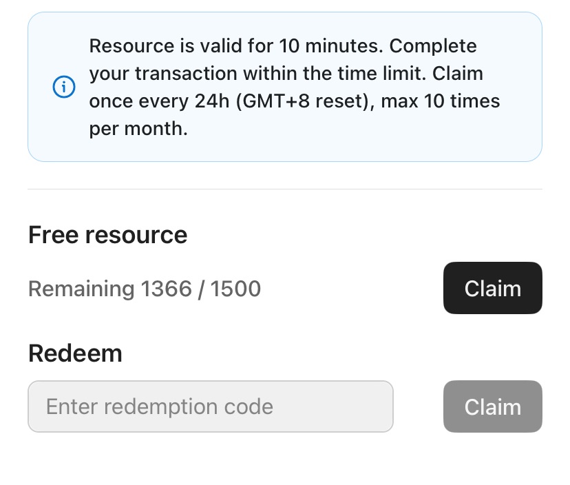- Automatische tägliche Allokation: Die Basis-5.000 Bandwidth sind standardmäßig kostenlos und erneuern sich jeden Tag um Mitternacht (UTC). Die OneKey-Subvention ist eine Extra-Hilfe: Du claimst sie manuell, und OneKey übernimmt die Gebühren für Transaktionen in den nächsten 10 Minuten über ein internes Resource-Rental-System (Miete von Bandwidth/Energy).