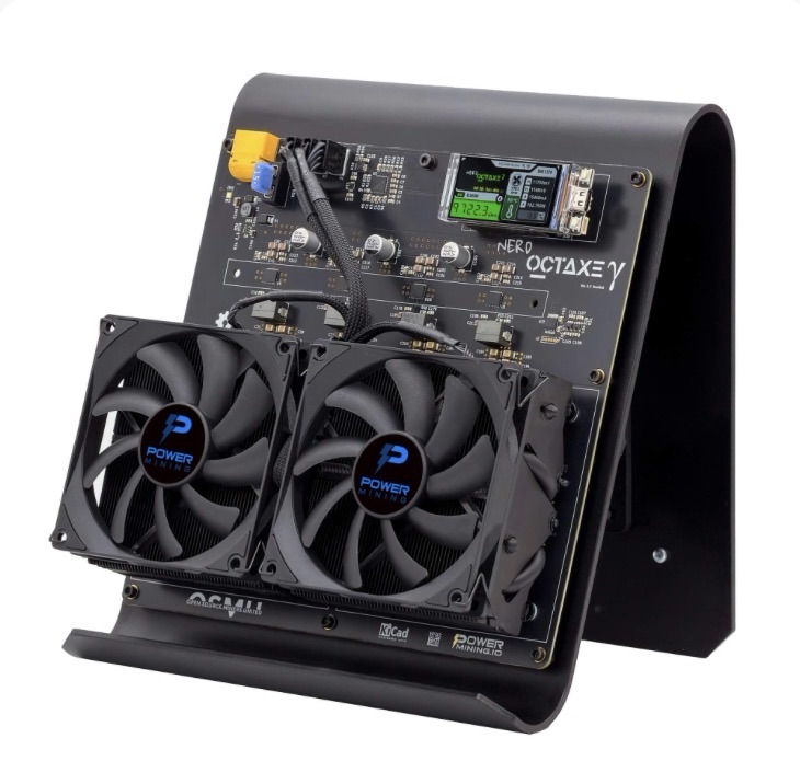 - Nerd Miner (z. B. NerdQaxe++ oder NerdOCTAxe): Die Nerd-Miner-Reihe umfasst verschiedene Modelle, von einfachen USB-Sticks mit niedriger Hashrate (z. B. V2 mit 77–980 KH/s bei 1–5 Watt) bis zu leistungsstärkeren Varianten wie dem NerdQaxe++ (4,8–6 TH/s bei 60–100 Watt) oder dem NerdOCTAxe (9,6 TH/s bei 160 Watt). Preise starten bei 15 US-Dollar für Basis-Modelle und gehen bis zu 450 US-Dollar für fortgeschrittene Modelle wie die oben genannten. Sie sind energieeffizient (ca. 15–20 J/TH) und eignen sich gut für den Heimgebrauch, mit Modi für Eco- oder Full-Power-Betrieb.